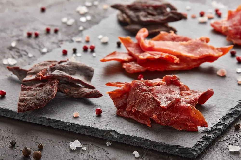 Different types of Jerky on a stone slab