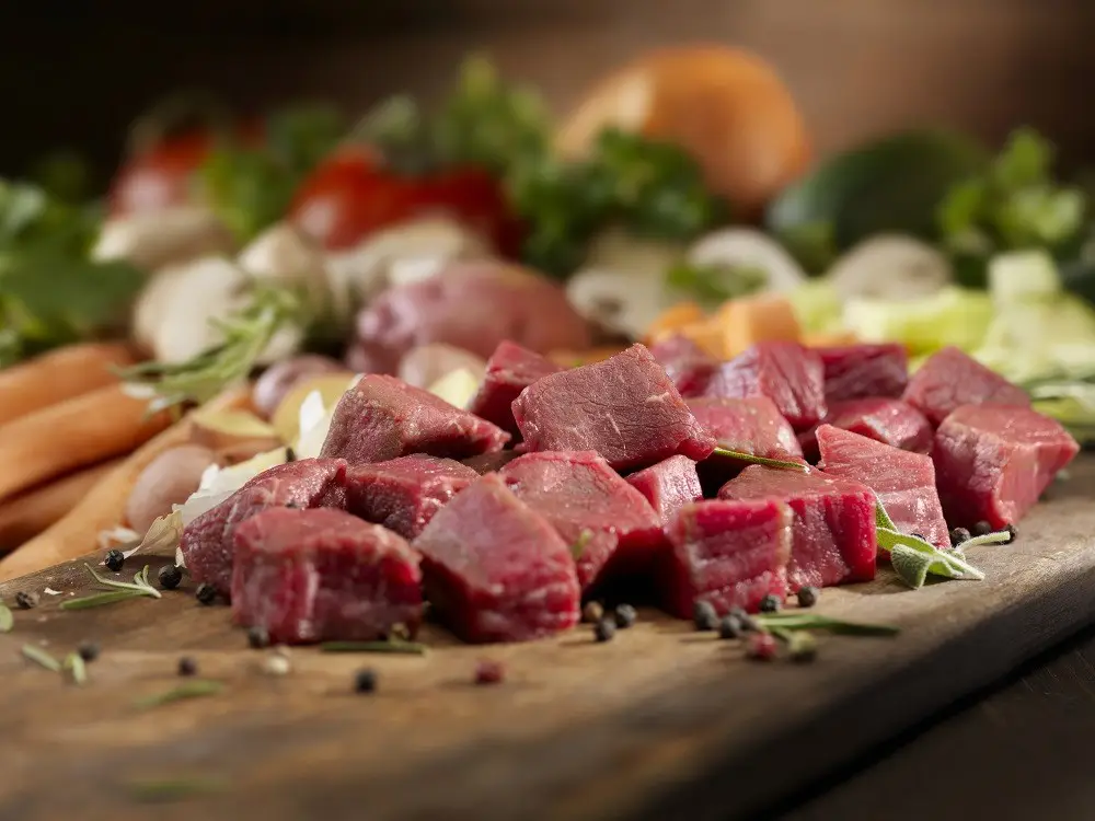 Beef cubes - diced - on a cutting board